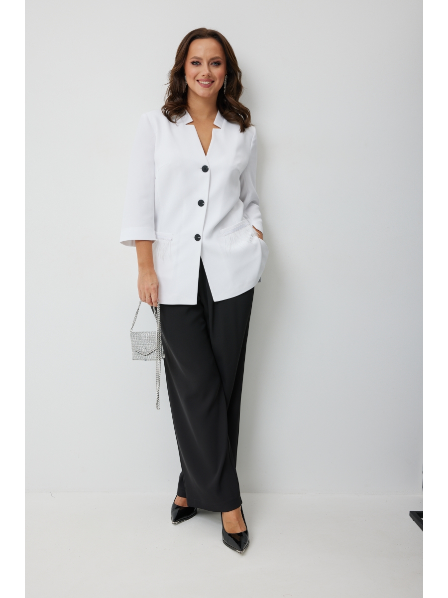 Жакет полуприлегающего силуэта из однотонной плательно-костюмной ткани, перед изделия на подкладке, центральная застежка на петли и пуговицы. Спинка со средним швом и вертикальными рельефами из проймы. По переду нагрудные вытачки, функциональные карманы с листочкой, декорированные тесьмой из перьев, в боковых швах разрезы. Горловина фигурной формы с плосколежащей стойкой. Рукав втачной двухшовный 3/4 длиной.