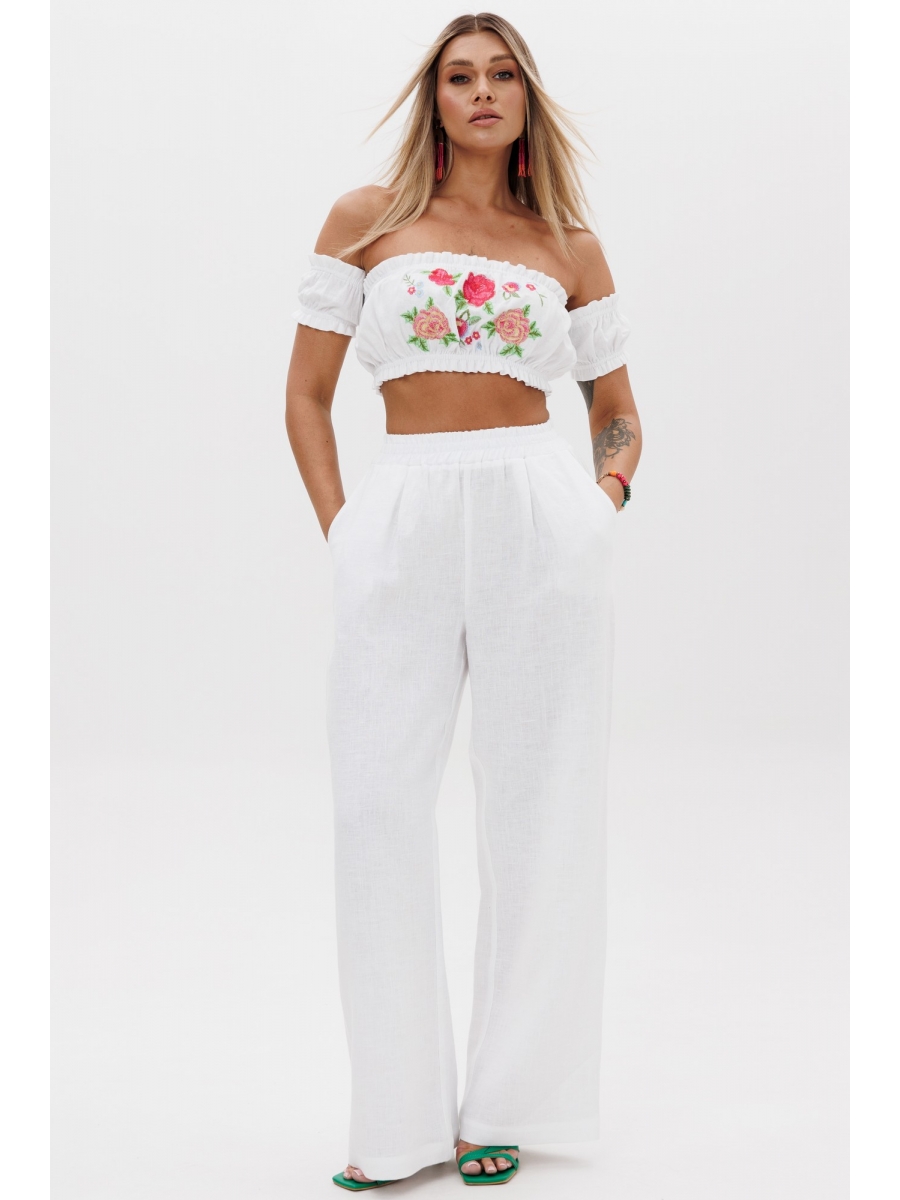 Стильный льняной костюм AMIE в романтическом стиле, состоящий из топа и брюк.