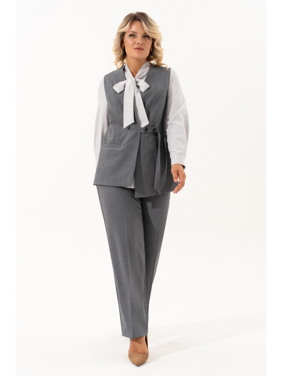 Костюм женский классический это идеальное решение для Вашего гардероба. Комплект состоит из двух предметов - прямые брюки с высокой посадкой прямого кроя на молнии и на резинке, с боковыми карманами сочетаются с любыми базовыми вещами. Универсальный классический жилет с V-образным вырезом горловины превосходно садится по фигуре, на правой полочке обработан прорезной карман с листочкой, на левой разрез , застежка обработана на отлетном хлястике ,на петлю и пуговицу. Этот элемент делает его более интересным. Жилет на подкладке . Ассиметричный жилет можно одевать поверх тонкой одежды. Базовый брючный костюм идеален для повседневного образа на работу в офис,школу, а при нарядной блузке комплект превращается в нарядный. Современный костюм также будет хорошо смотреться как вечерний наряд на различные мероприятия, праздники, день рождения, корпоратив. Шикарный нарядный станет незаменимым в Вашем гардеробе . Этот костюм подчеркнет Вашу уверенность и стиль.