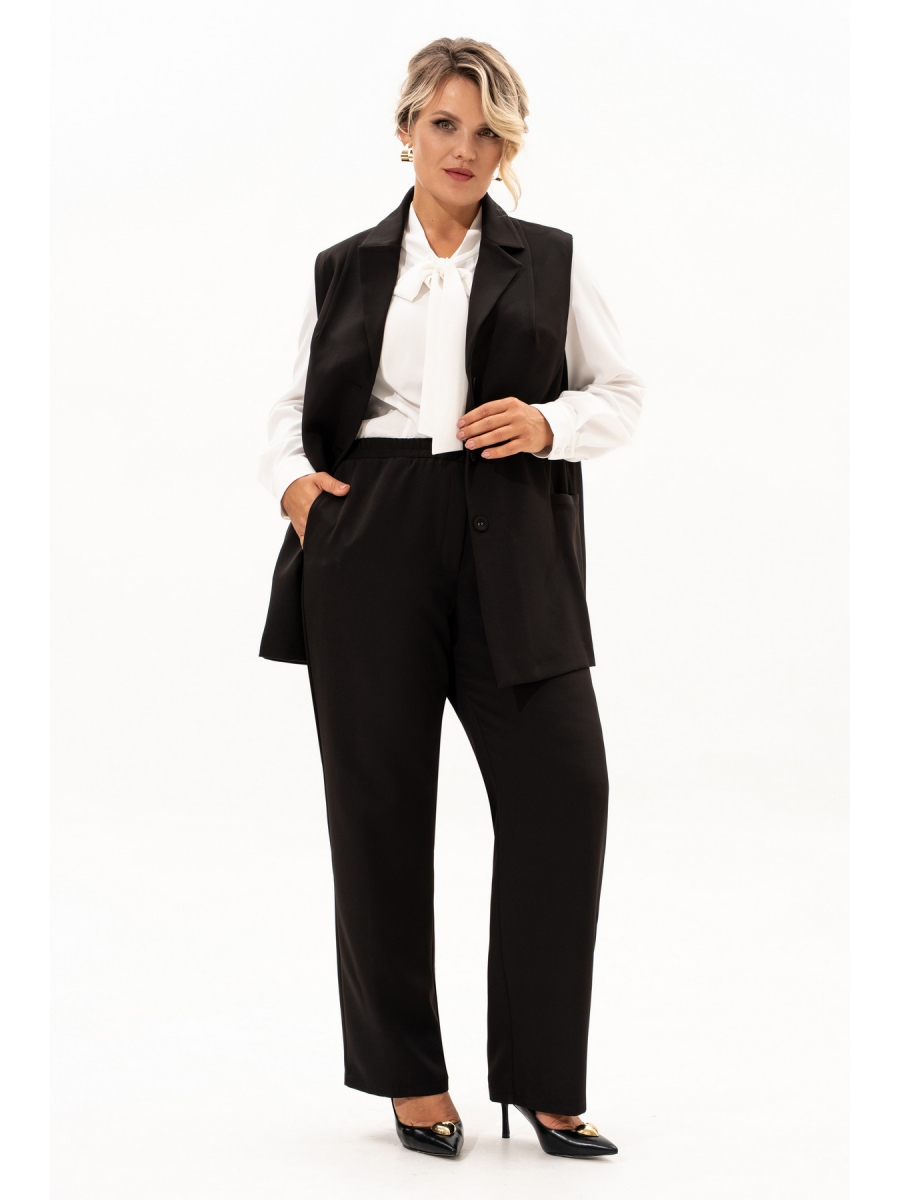 Элегантный костюм с жилетом – тренд осенне-зимнего сезона! Этот костюм является настоящей находкой для любой модницы, идеально сочетая строгий стиль и современный дизайн! Костюм-двойка, выполненный из качественной костюмной ткани, включает в себя классические прямые брюки и молодежный жилет, создавая гармоничный образ в духе old money.  Детали: Жилет – с лацканами и воротником, прорезными карманами с листочкой, на спинке обработаны шлицы в рельефах. Брюки – прямого силуэта на эластичной резинке по поясу с имитацией застежки-гульфика для удобства и безупречного силуэта. Этот универсальный костюм подходит для офиса, деловых встреч, вечерних мероприятий и праздничных выходов. Дополните его аксессуарами – и ваш образ заиграет новыми красками! С выбором этого костюма, стиль, комфорт и элегантность станут вашими спутниками в новом сезоне!