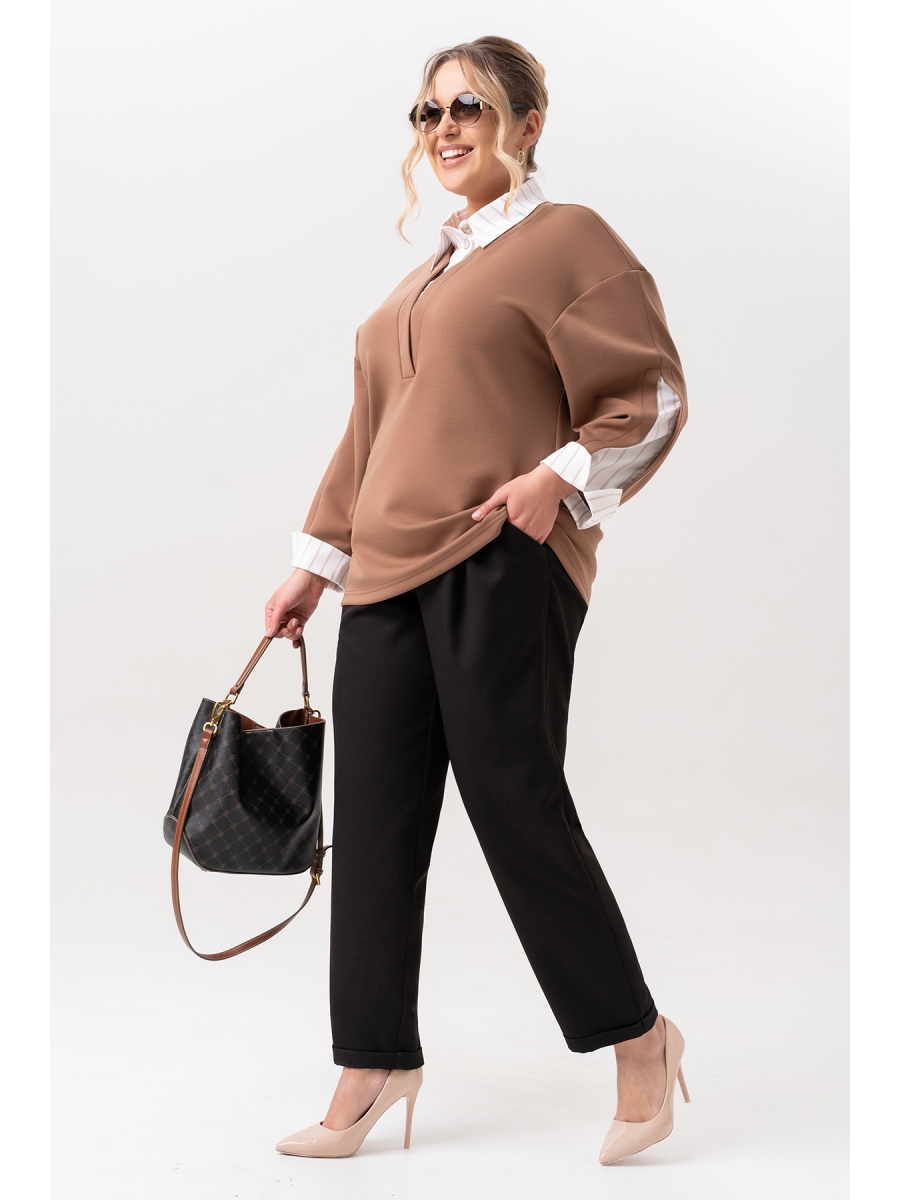 Практичный и удобный – он станет Вашим любимым костюмом, а трендовый дизайн делает его актуальным решением для девушек, которые следят за модой. Свитшот женский с имитацией рубашки- новинка коллекции. Изготовленный из качественного трикотажа и полоски на х/б основе, он обеспечивает дышащие свойства и гипоаллергенность, что особенно важно для женщин с чувствительной кожей. Подходит на осень, весну и для зимы. Ткань необычайно мягкая и приятная к телу. Свободный оверсайз крой изумительно подойдет для девушек и женщин больших размеров. На свитшоте обработан воротник и  застежка –планка на петли и пуговицы. Рукав комбинирован из двух тканей, с манжетой и разрезом. Модель подходит для высоких и для невысоких. Брюки с удобной ,высокой посадкой и боковыми карманами позволяют хранить мелкие вещи, такие как ключи или смартфон, что делает этот костюм не только стильным, но и практичным. По низу брюк обработаны манжеты. Пояс частично на резинке, застежка на молнию и петлю  с пуговицей.