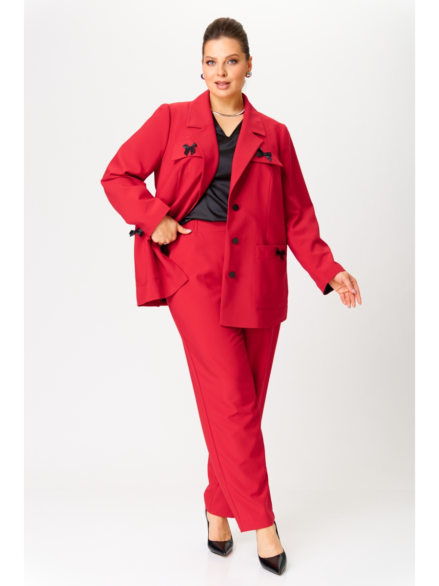 Жакет oversize, однобортный, прямого силуэта на контрастной подкладке. Отложной воротник с V-образным вырезом скроет несовершенства и визуально вытянет силуэт, сделает образ модным и стильным. Рукав втачной, двушовный, полномерный по обхвату. На полочках накладные карманы. На накладных карманах декоративные элементы - бантики контрастного цвета. Спинка с центральным швом.