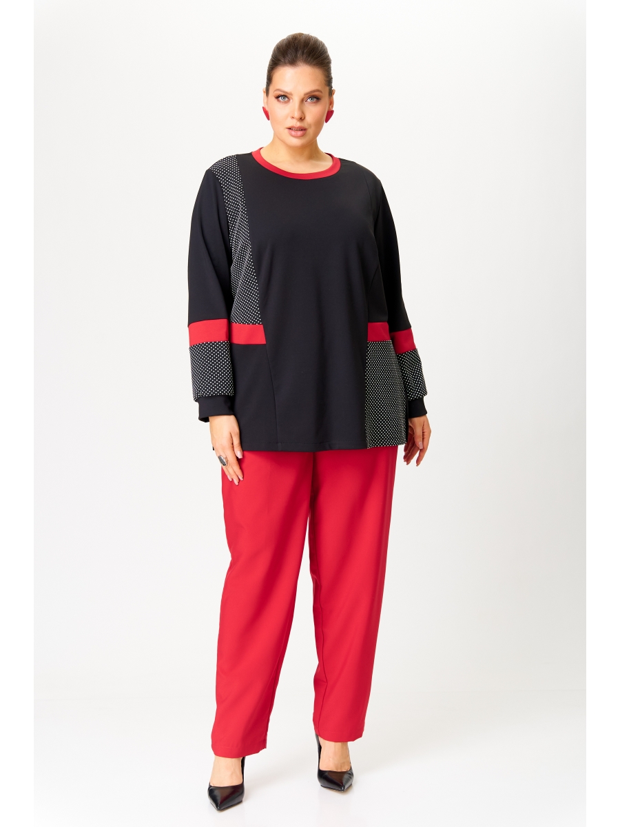 Комплект состоит из трикотажного джемпера и текстильных брюк.