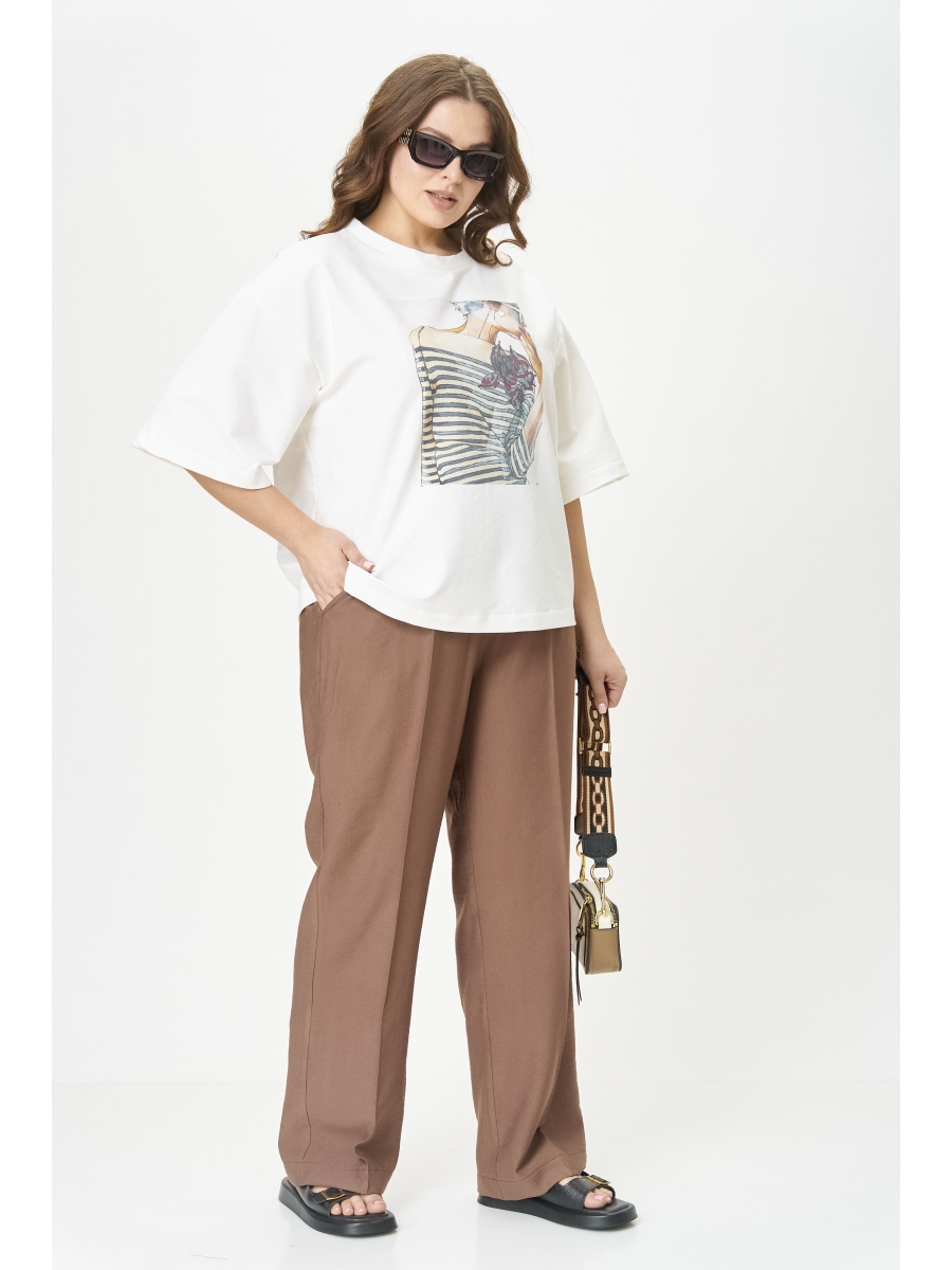Футболка женская оверсайз с круглой горловиной. Спущенное плечо, рукав широкий по обхвату, что дает свободу движения. На полочке - авторская печать и небольшая подвеска, что придает футболке оригинальность и завершает образ.