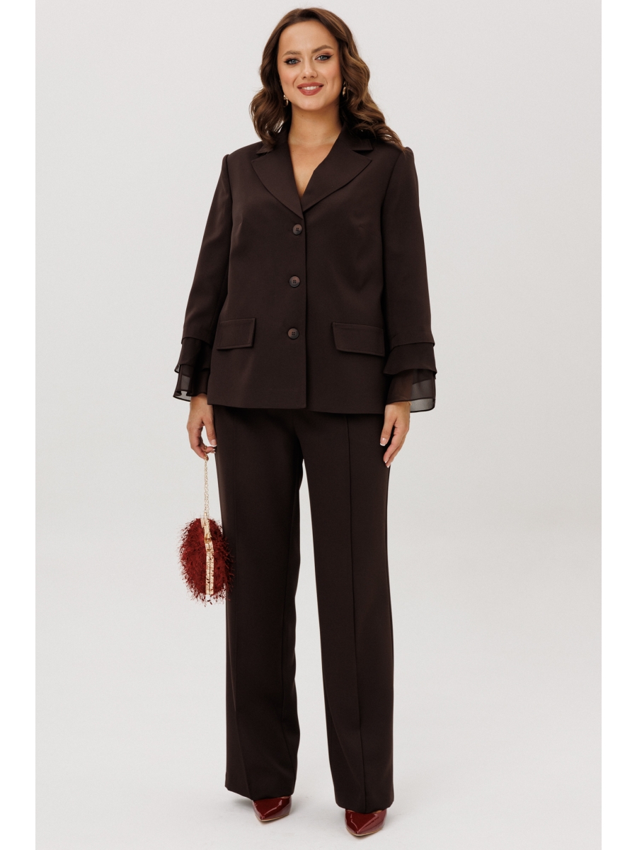 Жакет прямого силуэта с нагрудными вытачками по переду. Накладные клапаны, являются имитацией кармана. По горловине воротник с отложными бортами пиджачного типа. Застежка на три петли-пуговицы. По спинке центральный разрез эффектно оформлен декоративной вставкой из струящегося шифона, который дополняет отделочная пуговица (не функциональная при застегивании). Рукав втачной, двухшовный, длина 7/8. По низу рукава два притачных волана из шифоновой ткани. Жакет на подкладке.