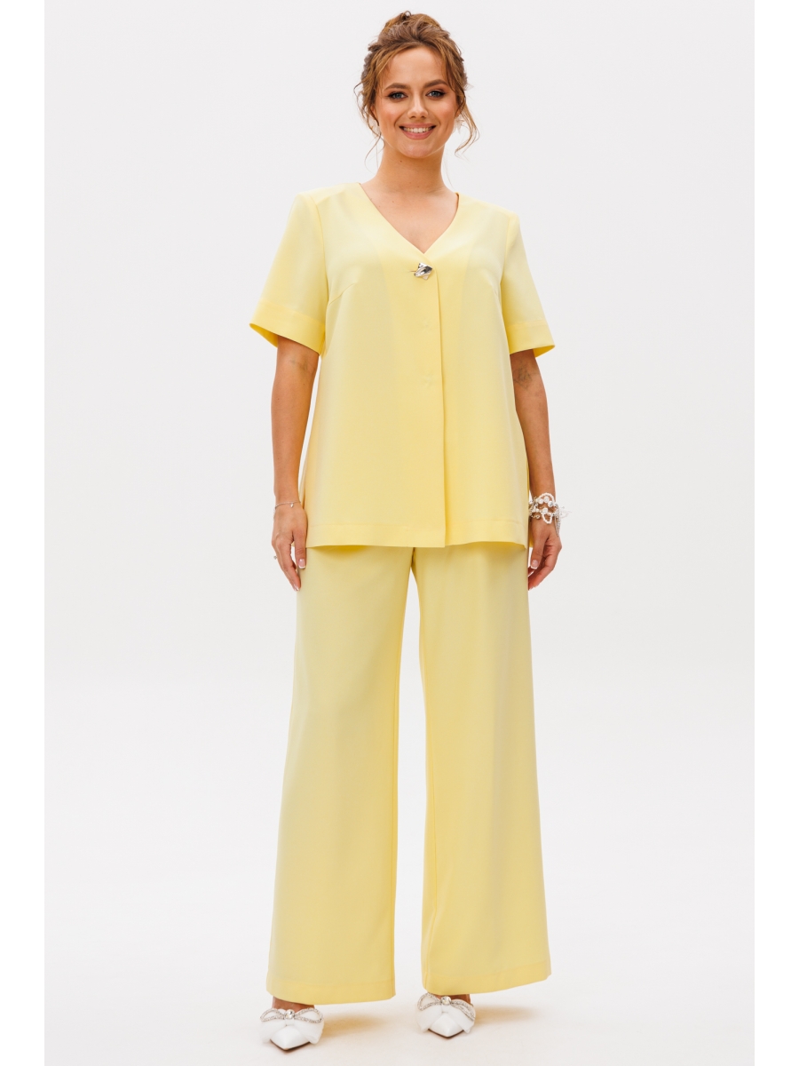 Жакет прямого силуэта без подкладки. По переду нагрудные вытачки. По спинке средний шов. По боковым швам – шлицы. Горловина с V-образным вырезом. Застежка центральная на отделочную пуговицу и две пришивные кнопки. Рукава втачные одношовные. Жакет дополнен съемным поясом из основной ткани.