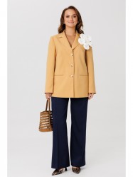 Жакет прямого силуэта. По переду нагрудные вытачки. Воротник с отложными бортами пиджачного типа. Застежка на три петли-пуговицы. На полочке функциональные карманы. Спинка с рельефами, переходящими в шлицу. На шлице застежка на три петли-пуговицы. Рукав втачной, двухшовный. Жакет на подкладке. Декоративным элементом является съемный цветок.