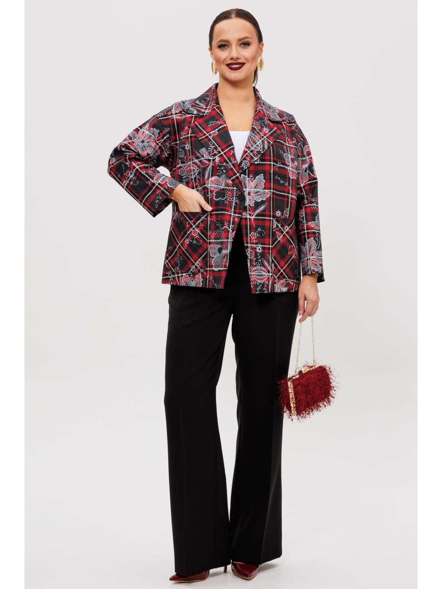 Жакет прямого силуэта со спущенной линией плеча, выполнен из костюмной ткани в клетку с принтом имитация вышивки (не тянется). По переду нагрудная вытачка, накладные карманы, центральная застежка на одну петлю-пуговицу. Горловина оформлена воротником пиджачного типа с лацканом. Спинка со средним швом. Рукава одношовные, длиной 7/8. Жакет без подкладки.