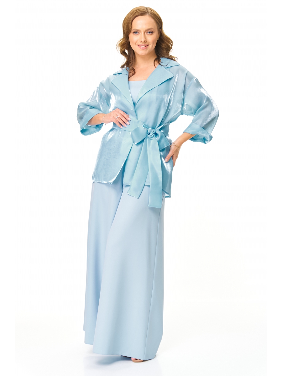 Шазюбль из легкой органзы свободного кроя, без застежки. С воротником и лацканами пиджачного типа. Рукав 3/4 с манжетой. Съемный пояс делает образ романтичным.