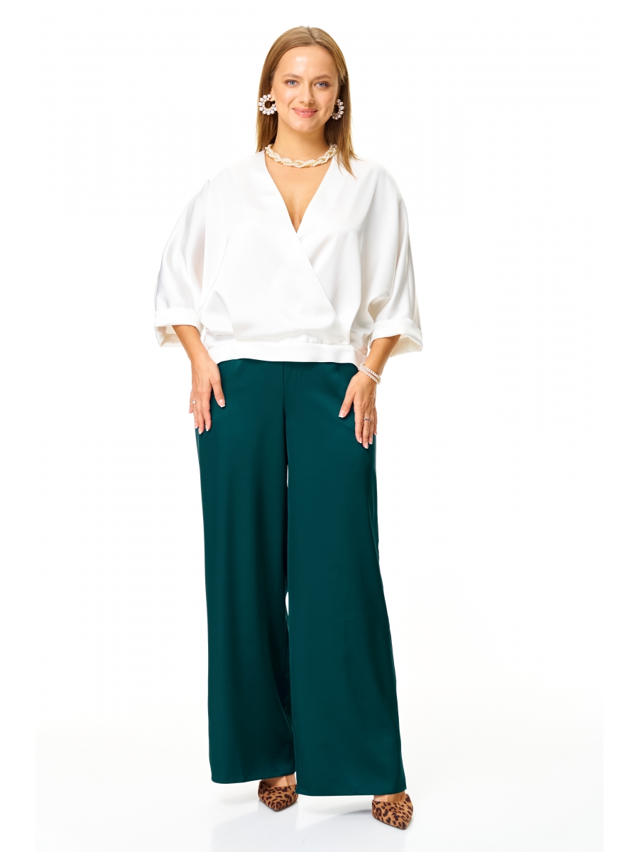 Блуза свободного силуэта. Горловина «на глубокий запах». Рукав цельнокроеный с манжетой. По низу переда планка, спинка удлиненная, прямая.