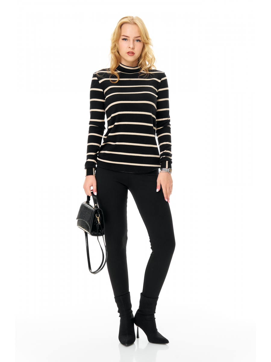 Гольф из мягкого трикотажного полотна в полоску, полуоблегающего силуэта, с воротником «стойка». Рукав длинный.