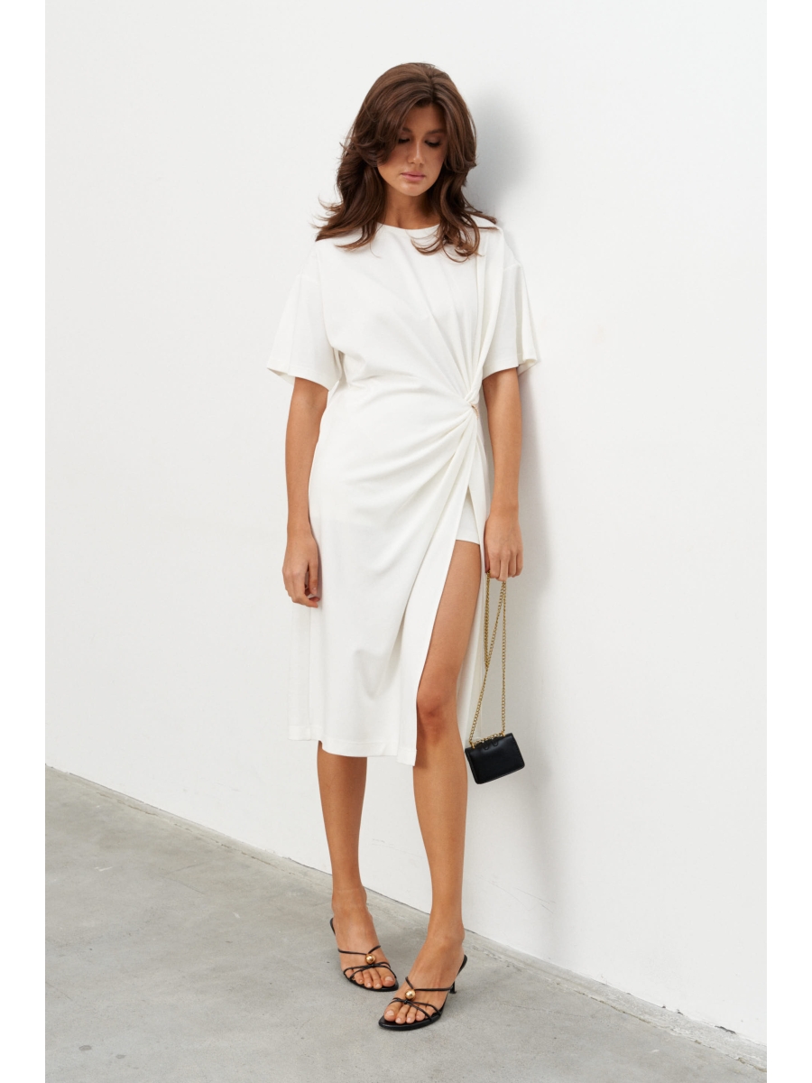 Платье со спущенным плечом и рукавом до локтя, горловина отделана эластичной бейкой. Сбоку, чуть ниже талии, конструктивный элемент в виде узла, переходящего в высокий разрез. Через узел протянуто декоративное золотое кольцо.