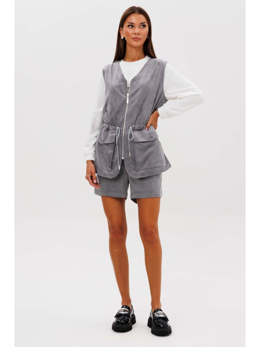 Нестандартный жилет с накладными карманами-пеналами с клапаном. Регулирующая кулиса, подчеркивающая талию. Свободный силуэт, центральная застежка на тесьму молнию, фигурная линия низа. Жилет на подкладке.