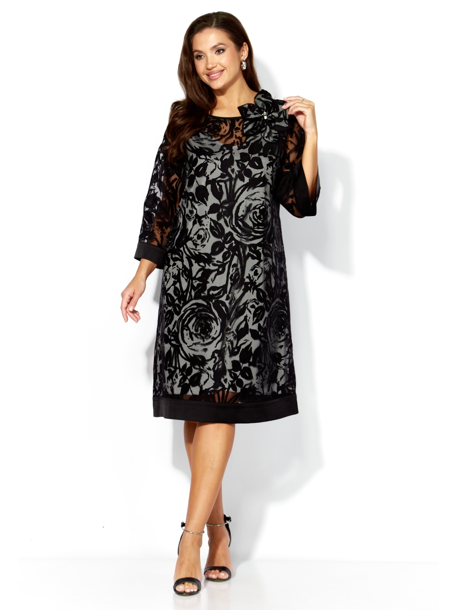 Верхнее платье выполнено из ткани органза. Платье А-силуэта с рукавом длинной 3/4. Рукав со спущенной линией плеча. По низу рукава и платья отделочные планки из атласа. Вырез горловины по переду "лодочка", по спинке фигурный акцентирован атласной бейкой. По спинке декоративная нашивка.