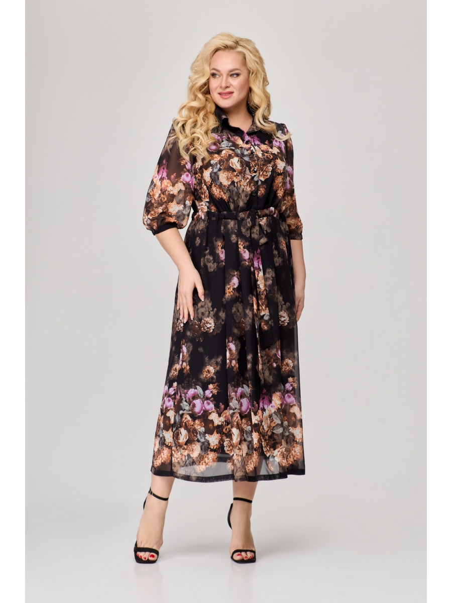 Платье женское, из нежного шифона расширенное к низу, с втачным рукавом. Застежка на петли и пуговицы, по горловине рубашечный воротник. Рукав 3/4 свободного кроя со сборкой по окату и низу. Платье с завышенной линией талии, притачной кулисой и поясом. По нижней части переда и спинки мягкие складки. Перед и спинка платья на трикотажной подкладке. Фурнитура может меняться в зависимости от наличия.