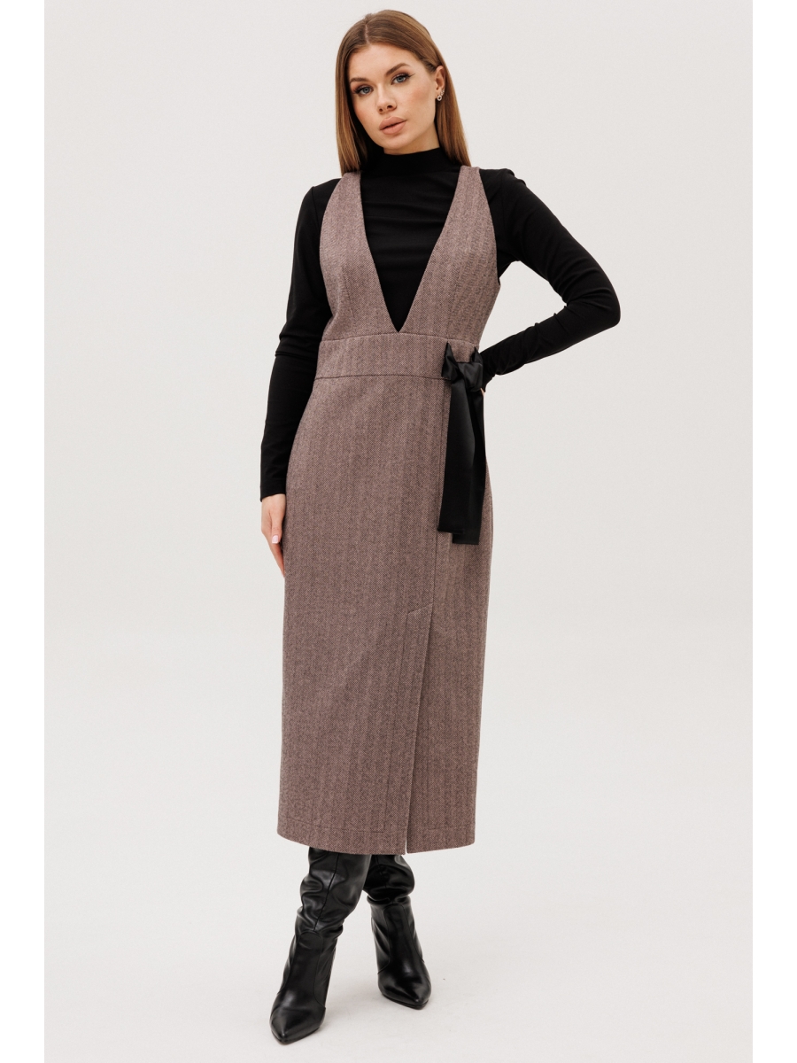 Сарафан женский прилегающего силуэта с V-образным вырезом, вытачками на лифе. На притачном поясе декоративный элемент (бант) из атласной черной ткани. По переду разрез. На спинке сарафана молния. Длина миди. Изделие на подкладке.