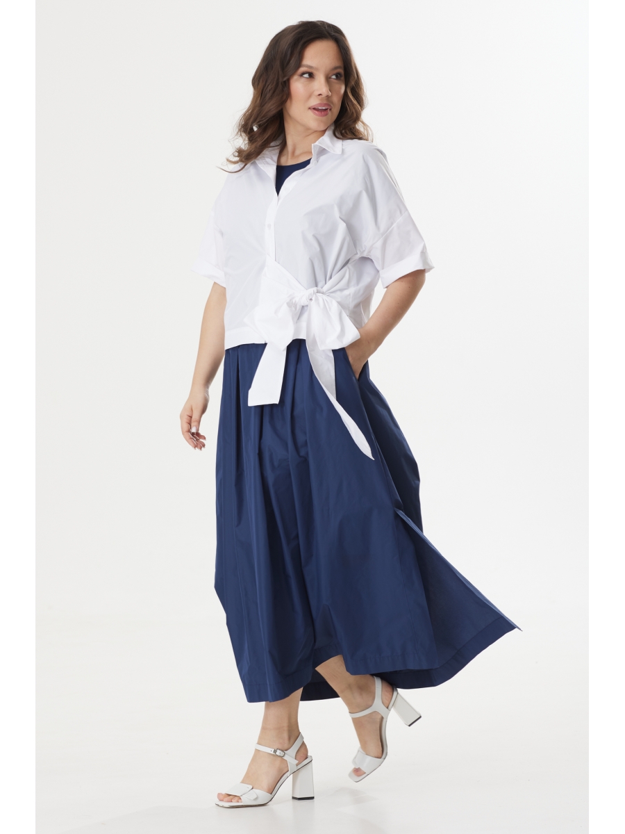 Блуза свободного кроя с центральной застежкой на пришивные пуговицы. Дополнена пришивным поясом, который завязывается в красивый бант, либо другим способом. Горловина обработана отложным воротником. Рукав втачной, слегка спущен. Выполнена блуза из тонкой тафты белого цвета. Ткань комфортная к телу и имеет отличный визуал.