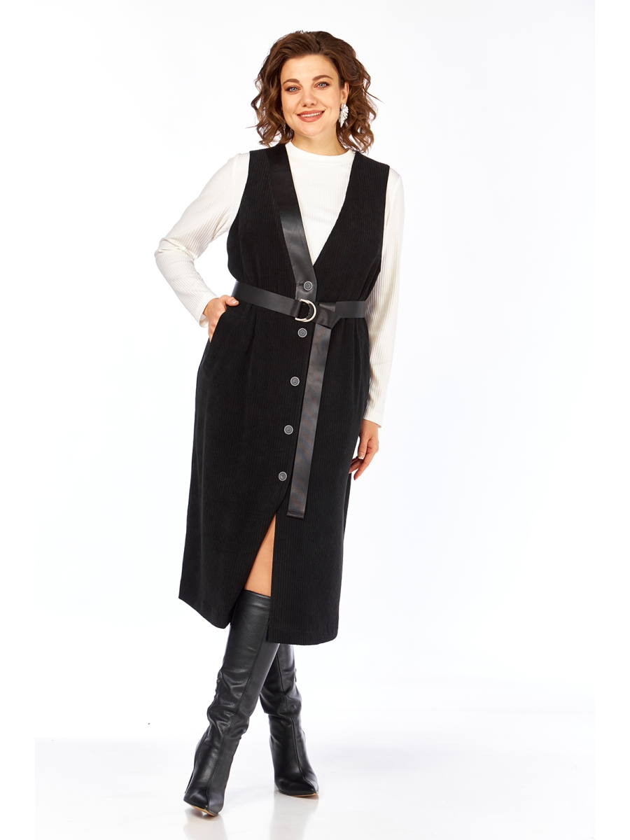 Сарафан прямого силуэта из трикотажного полотна с имитацией вельвета. Горловина V-образной формы с отделкой из экокожи. Застежка центрально — бортовая на петли и пуговицы. По переду нагрудные вытачки и обработаны карманы с листочками. На спинке фигурный вырез. Сарафан на подкладке.