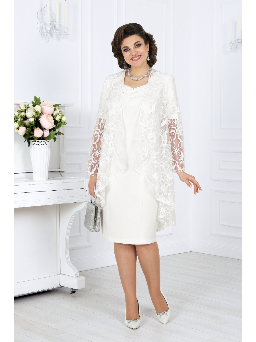 Комплект женский, состоящий из платья, выполненного из костюмно-плательной ткани и кардигана из гипюра. Платье женское полуприлегающего силуэта, длиной по среднему шву спинки р 50 52,54,56,58 - 104 см; р. 60,62,64 - 105,5 см. Перед с рельефными швами, проходящими через центр груди, идущими от пройм до низа. Центральная часть переда в области горловины с фигурными подрезами, декорированы кружевом и стразами. Спинка с рельефными швами, идущими от пройм до низа, со средним швом, в верхней части которого расположена застежка на потайную тесьму-"молнию", в нижней – шлица. Горловина спинки округлой формы, переда – фигурное каре, декорирована стразами. Рукав втачной, одношовный, длиной 27 см. Кардиган свободного силуэта, длиной по середине спинки р. 50,52,54,56,58 - 98 см; р. 60,62,64 – 99,5 см, от шва втачивания воротника. Низ кардигана ассиметричной формы: укороченный спереди, удлиненный к центру спинки. Борта и горловина оформлены отложным воротником-шаль. Рукава втачные, одношовные. Длина рукавов 59 см. Низа рукавов оформлены фестонами.