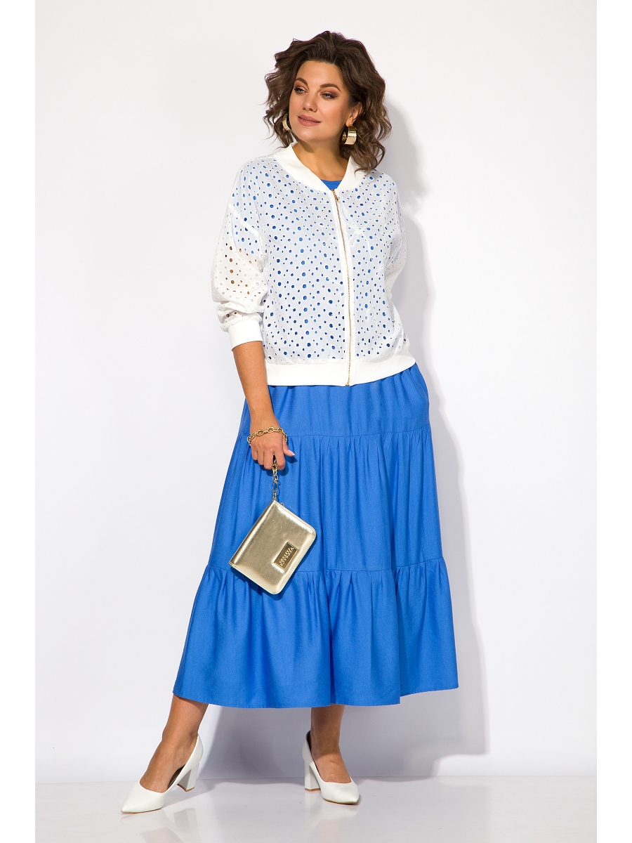 В комплекте идет облегченный жакет, по типу бомбера с застежкой на металлическую молнию, выполнен из хлопковой ткани с вышивкой ришелье. Рукав на спущенном плечевом поясе. Вырез горловины, низ изделия и рукавов оформлен мягкой притачной планкой из кашкорсе. Спинка без особенностей.