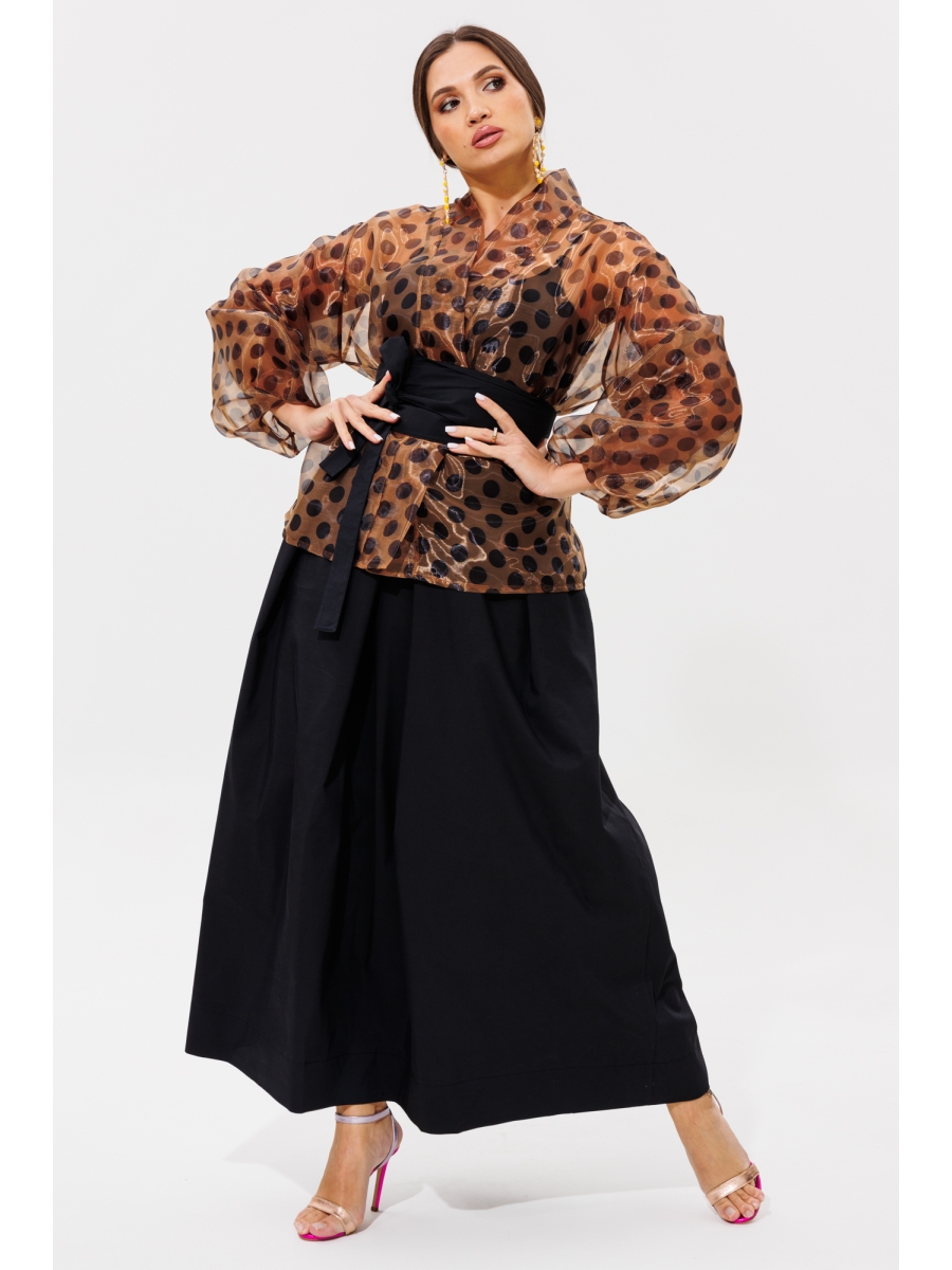 Туника прямого силуэта из органзы в горох со спущенной линией плеча. Рукав двойной, расширенный к низу со складками. По спинке и полочке идет планка. С ее помощью легко можно трансформировать повседневный образ в праздничный.