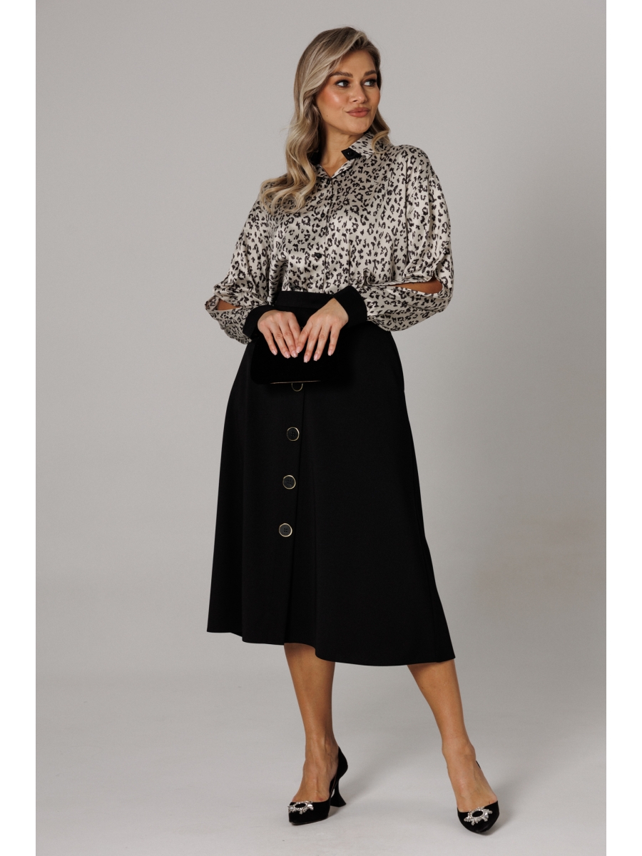 Юбка А-силуэта, длинна миди. По передней части идет застежка-обманка с пуговицами. По бокам карманы. По спинке средний шов, переходящий в застежку молнию. Пояс отрезной.