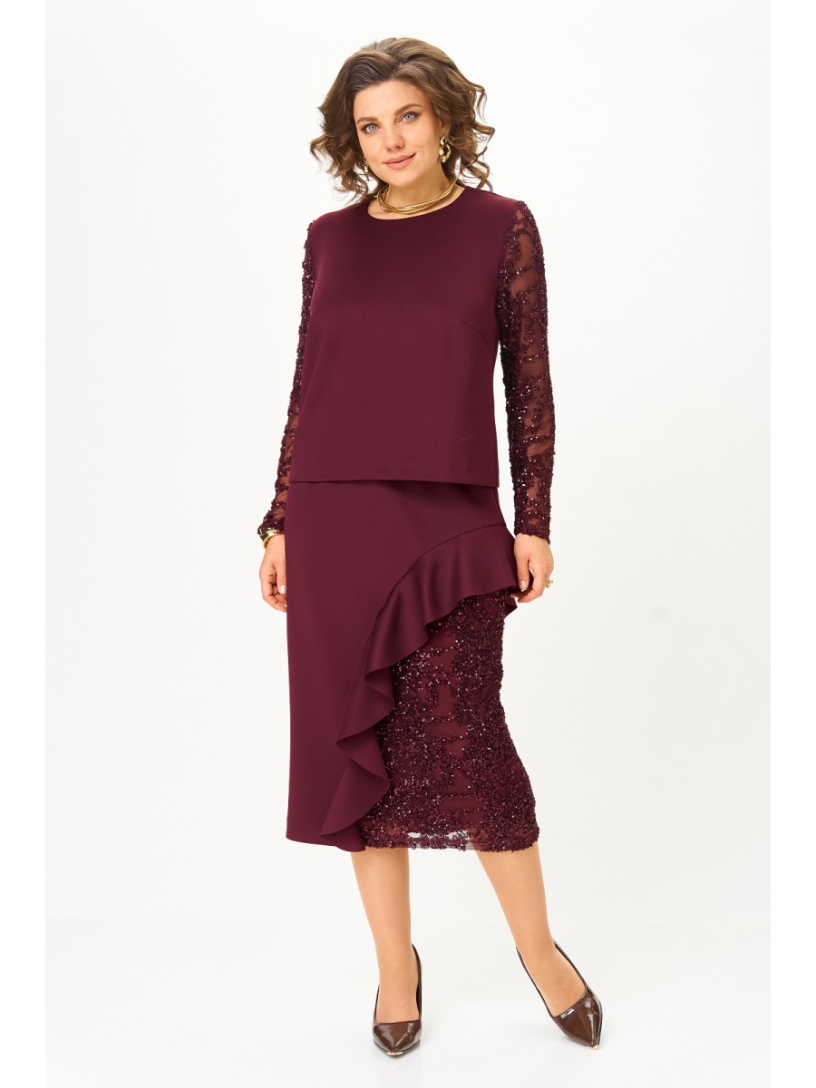 Юбка удлиненная, прямая, на подкладке, сбоку по низу переда и спинки фигурная вставка из трикотажной сетки с паетками и воланом.
