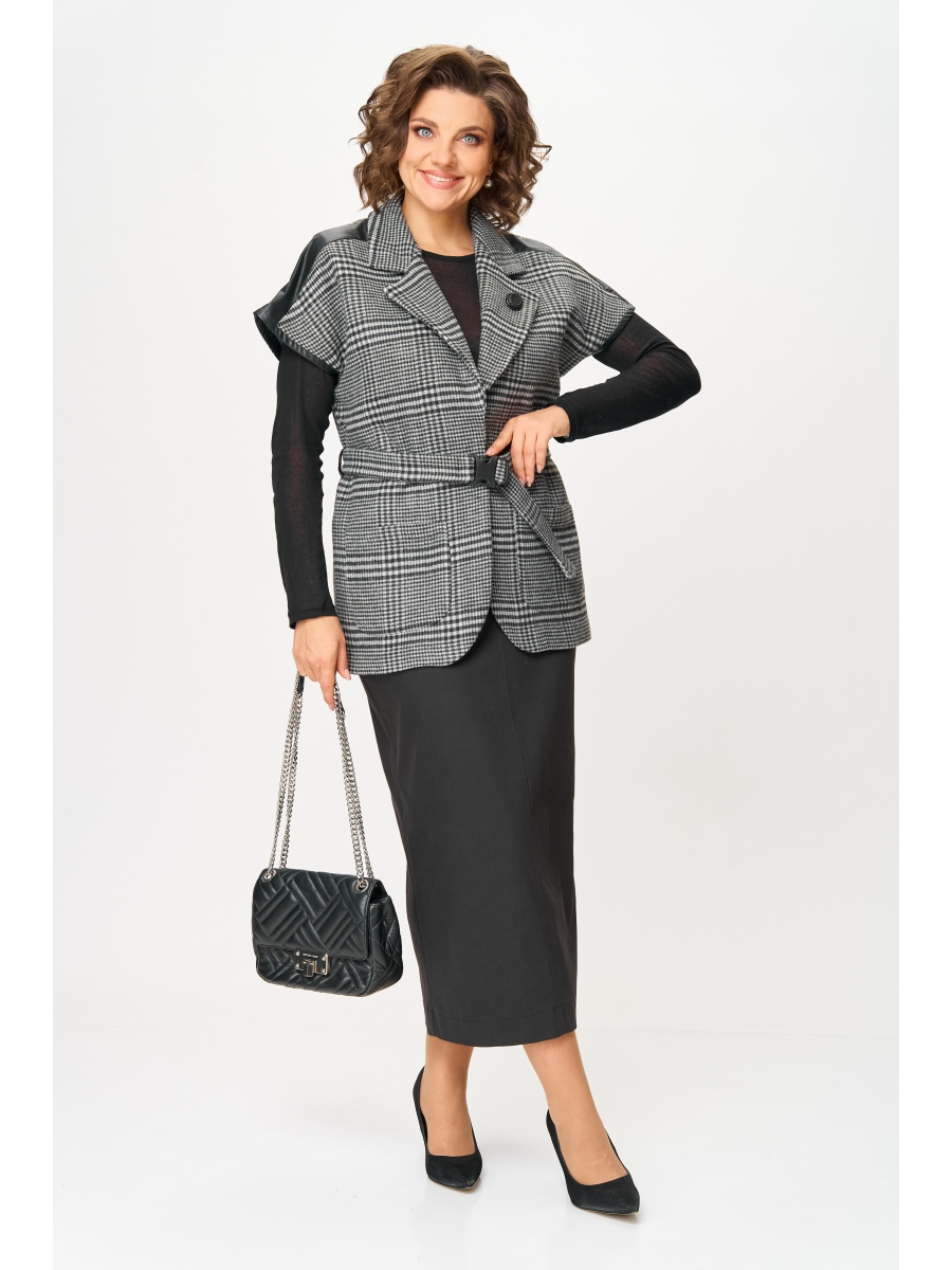 Этот комплект объединяет стильную клетку, трендовую джинсовую юбку и акцентные детали, оставаясь универсальным выбором для офиса, встреч и casual-образов.