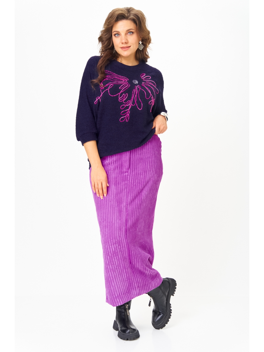 Комплект включает в себя яркий темно-синий джемпер с рукавами реглан «летучая мышь» и изящную юбку в пурпурных тонах, выполненную из мягкого, приятного к телу вельвета.