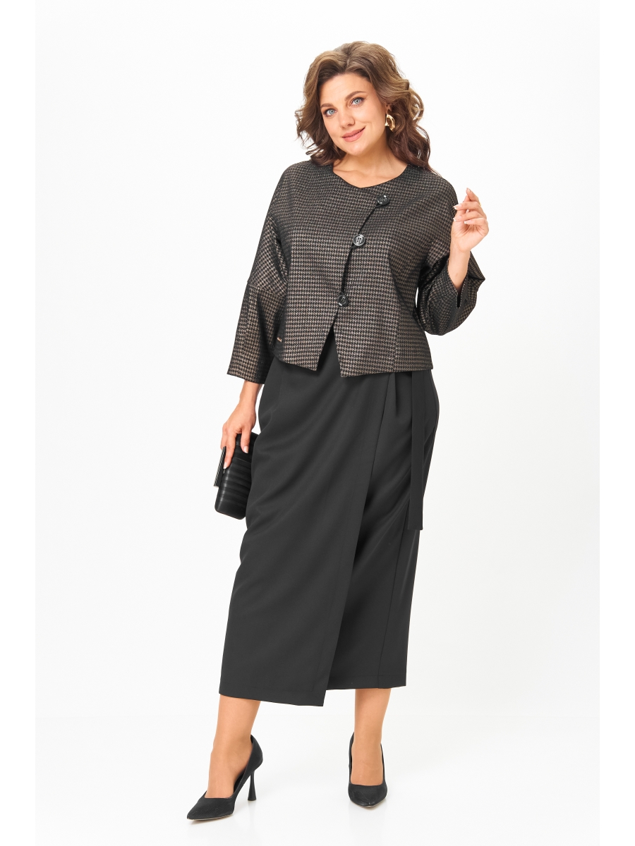 Жакет с люрексовой золотой нитью и юбка с мягким запахом образуют безупречный дуэт стиля и уверенности.