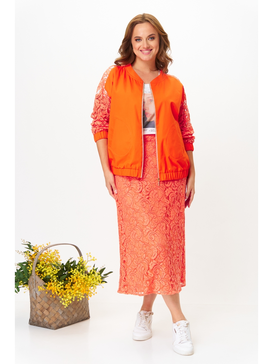 Комплект женский состоящий из бомбера и юбки .Бомбер женский скомбинирован из текстиля гипюра , отлично подойдет для торжественных случаев и так же для летних прогулок . Застежка центральная на металлическую молнию . Спереди прорезные карманы в рамку с втачной листочкой и отделочной строчкой по контуру мешковины . Юбка женская из гипюра для повседневной носки и торжественных случаев . Юбка расширена к низу , длиной ниже колена . Застежка на потайную молнию и вставки из эластичной тесьмы по бокам пояса, подчеркивают линию талии .
