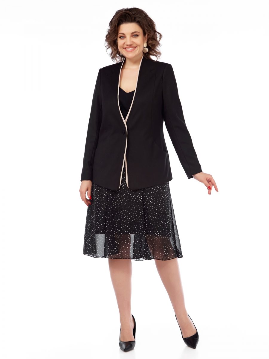 Жакет полуприлегающего силуэта из костюмной ткани с содержанием вискозы 70% на подкладке. По переду декоративные рельефы с функциональными карманами, рукава втачные, застежка на одну петлю и пуговицу. Декор по линии борта и горловине из ткани контрастного цвета (в тон горошков на юбке).
