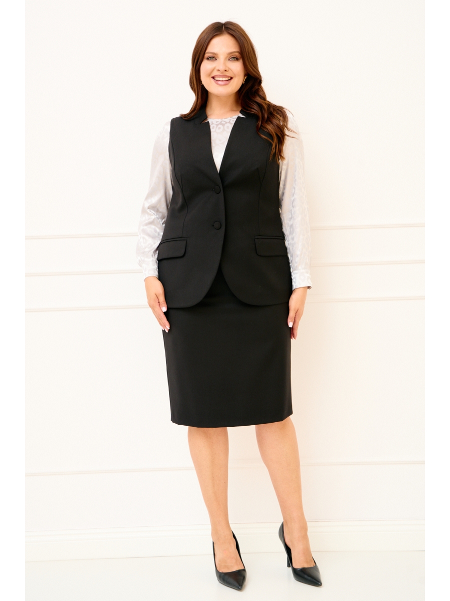 Юбка классическая "карандаш" на подкладке с завышенной линией талии на поясе-обтачке застегивается на тесьму-молнию и имеет сзади шлицу. Юбка и жилет выполнены из высококачественной ткани с содержанием вискозы 70%.