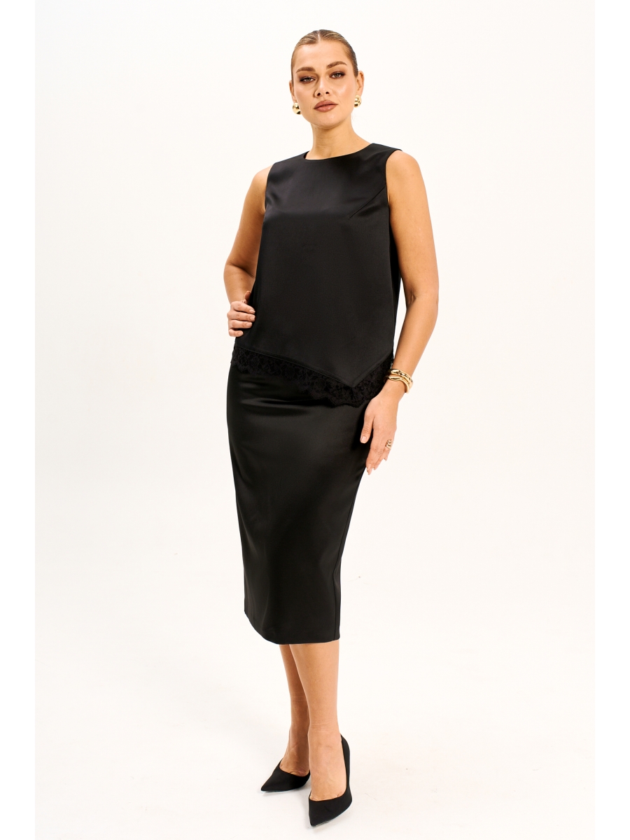 Блуза с ассиметричной линией низа дополнена французским кружевом, которое держит форму; в боковых швах разрезы; по спинке застежка в виде "капельки" с петлей и пуговицей.