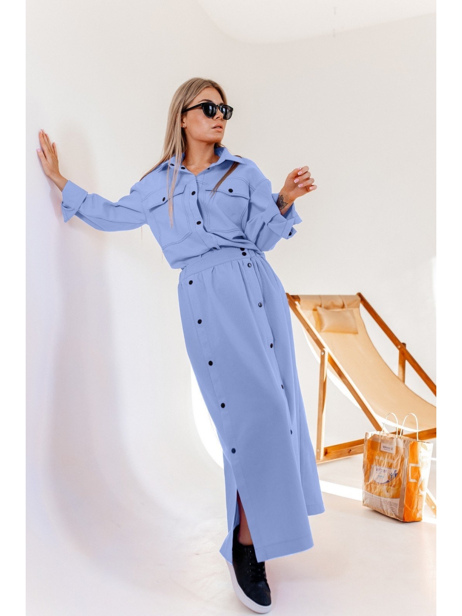 Элегантный женский костюм, состоящий из жакета и юбки, выполнен в приглушенном голубом цвете, добавляющем изысканность образу.