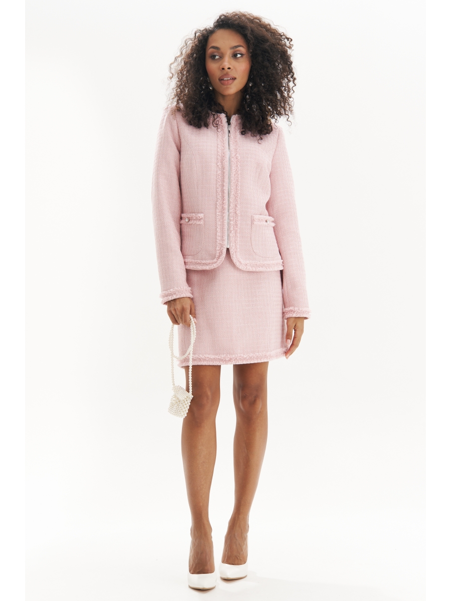 Этот элегантный твидовый костюм в нежно-розовом оттенке — воплощение женственности и утончённого стиля. Жакет с аккуратной молнией спереди украшен изысканной бахромой и декоративными карманами с жемчужными пуговицами, придающими образу аристократичную нотку. Этот комплект прекрасно подойдёт как для деловых встреч, так и для особых случаев, когда хочется выглядеть роскошно, но ненавязчиво. Дополните образ классическими лодочками и миниатюрной сумочкой, чтобы подчеркнуть его утонченность.