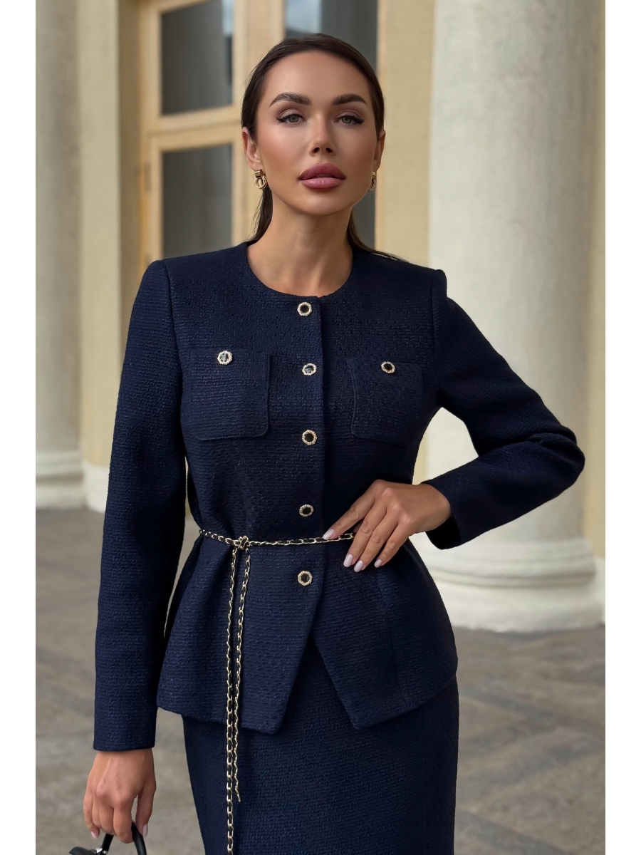 Жакет полуприлегающего силуэта, на подкладке, с центральной бортовой застежкой до верха на 5 петель и 5 декоративных пуговиц (размер и цвет фурнитуры может незначительно отличаться от фото) с фигурными к низу бортами. Перед с полурельефами и с нагрудными вытачками. В верхних частях с накладными карманами закругленной формы, застегивающимися на 1 петлю и пуговицу. Спинка со средним швом, с рельефами. Рукава втачные, двухшовные, длинные. Горловина круглая, обтачная. Жакет с плечевыми накладками и декоративным поясом – цепочкой.