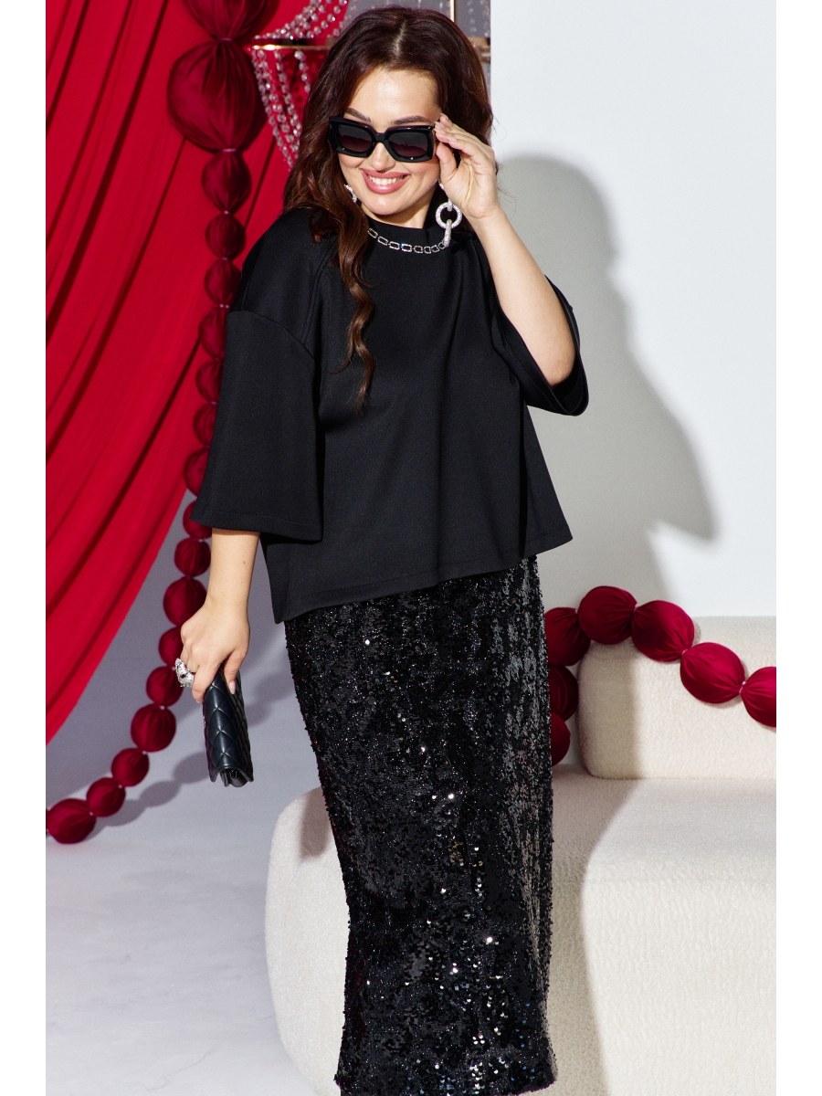 Черный женский комплект состоит из однотонной блузы и юбки миди, украшенной фактурной черной пайеткой.