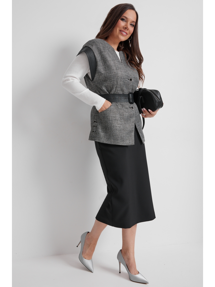 Удлиненный жилет свободного прямого кроя, на подкладке, с центральной застежкой на пришивные пуговицы. Дополнен удобными карманами и съемным красивым поясом. Жилет выполнен из красивой костюмной ткани.