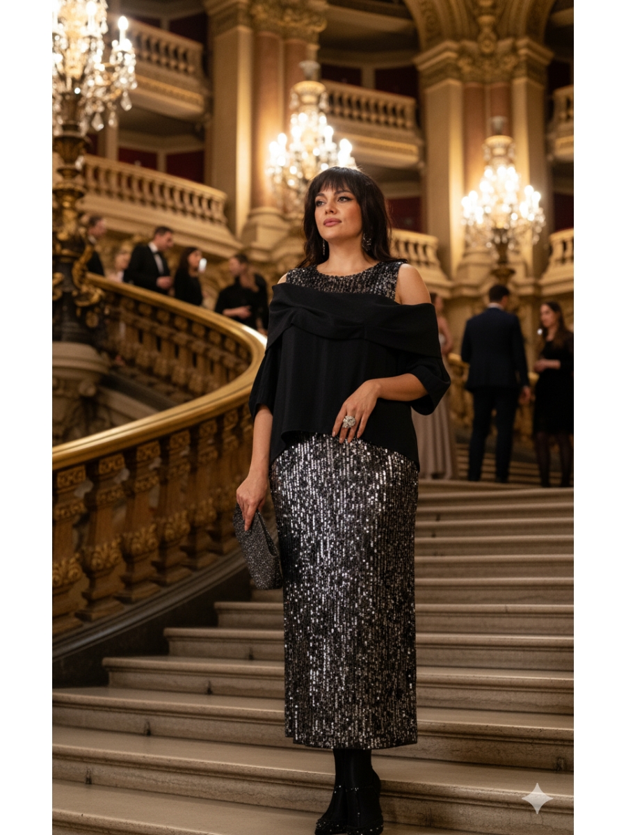 Юбка длины «миди», прямого силуэта немного расширяется к низу. Пояс в юбке цельнокроеный с эластичной тесьмой-резинкой. Длина миди придаёт образу неустаревающую классику и грацию. Плотное полотно, сплошь усыпанное мелкими пайетками графитового и серебристого оттенков, не просто отражает свет, а мягко излучает собственное, приглушённое свечение. Юбка на подкладке.