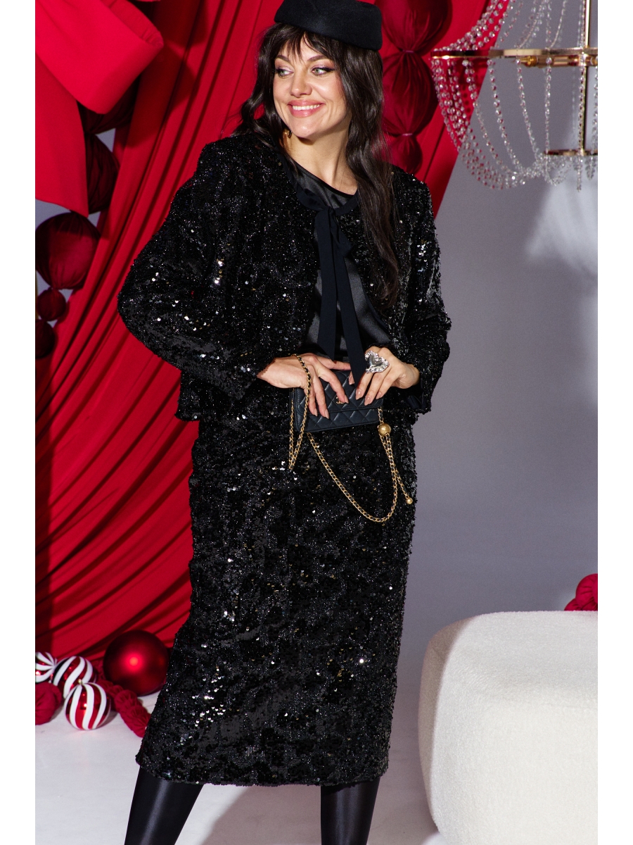 Юбка длиной миди держит внимание за счет ткани, украшенной в густую, слегка крупную фактурную пайетку. Юбка прямого силуэта с притачным поясом со вставкой эластичной тесьмы-резинки в бочках. В среднем шве заднего полотнища юбки застёжка на молнию и пуговицу в поясе.