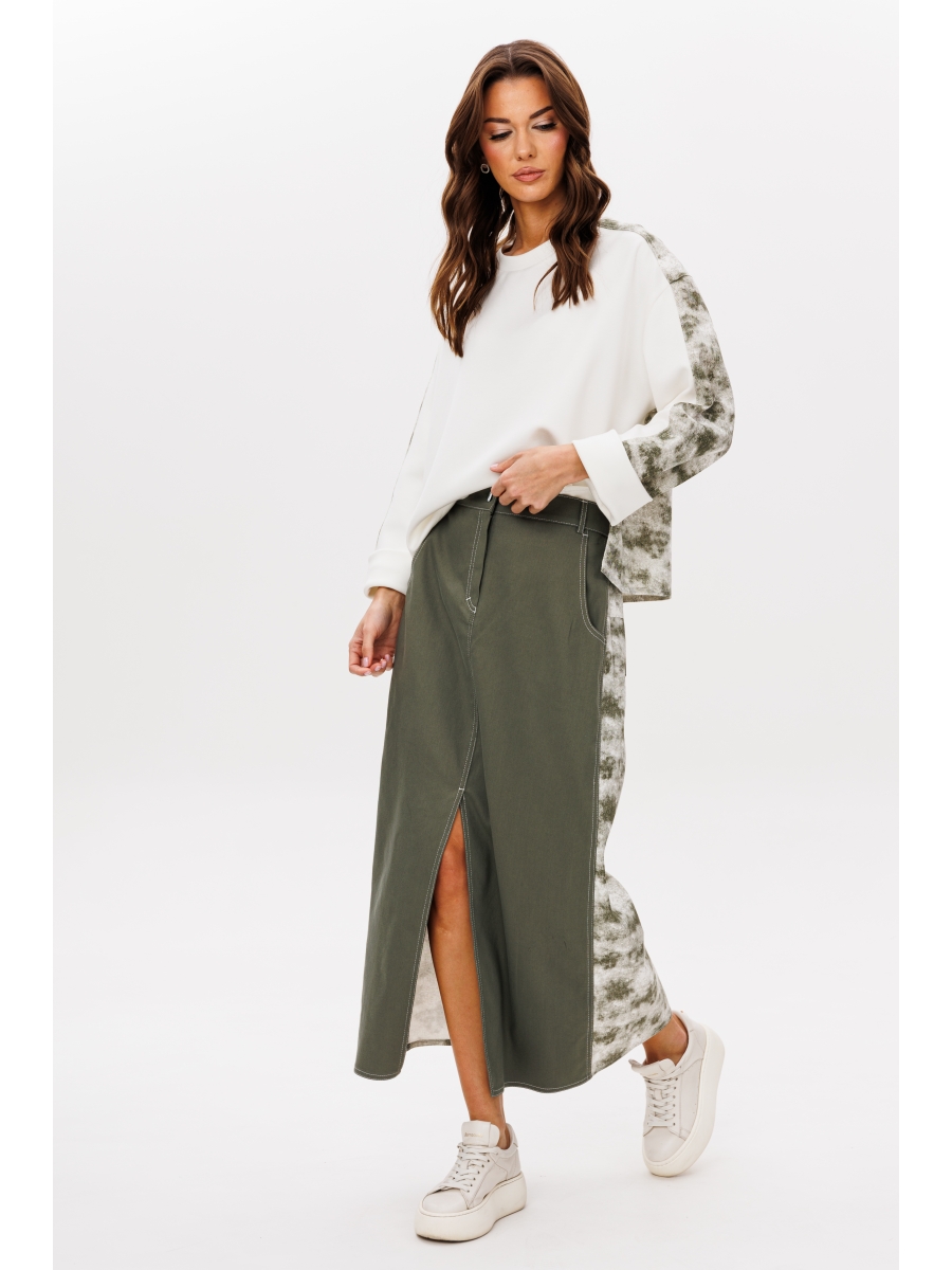 Юбка А-силуэта, на притачном поясе со шлевками, эластичном в области спинки, с перемещенным боковым швом в сторону полочки, наклонным боковым карманом, центральным швом с застежкой и разрезом. Переднее полотнище юбки-из однотонного полотна, заднее-из принтованного. На задних половинках юбки-отрезные кокетки и накладные карманы из отделочного полотна.