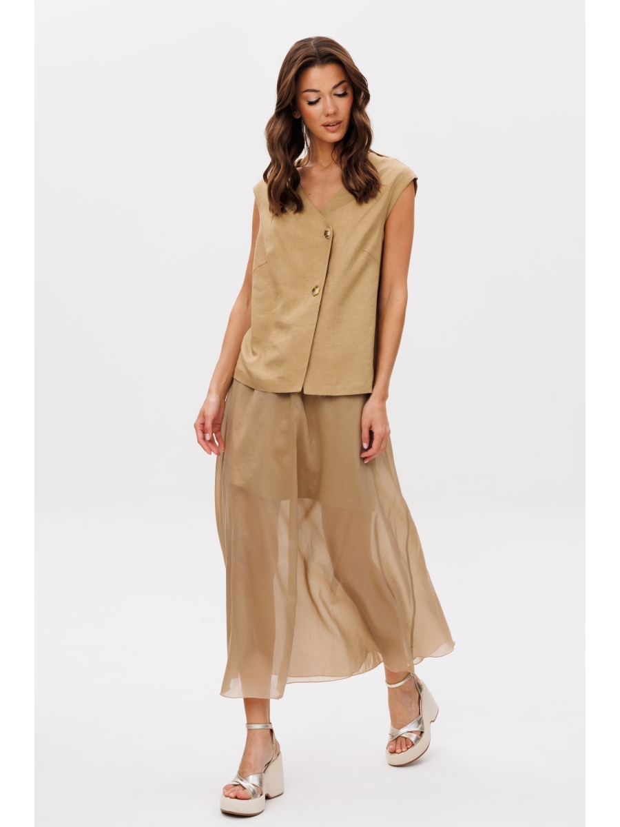Жилет свободного покроя, средней длины с асимметричной застежкой. Полочка с нагрудной вытачкой.