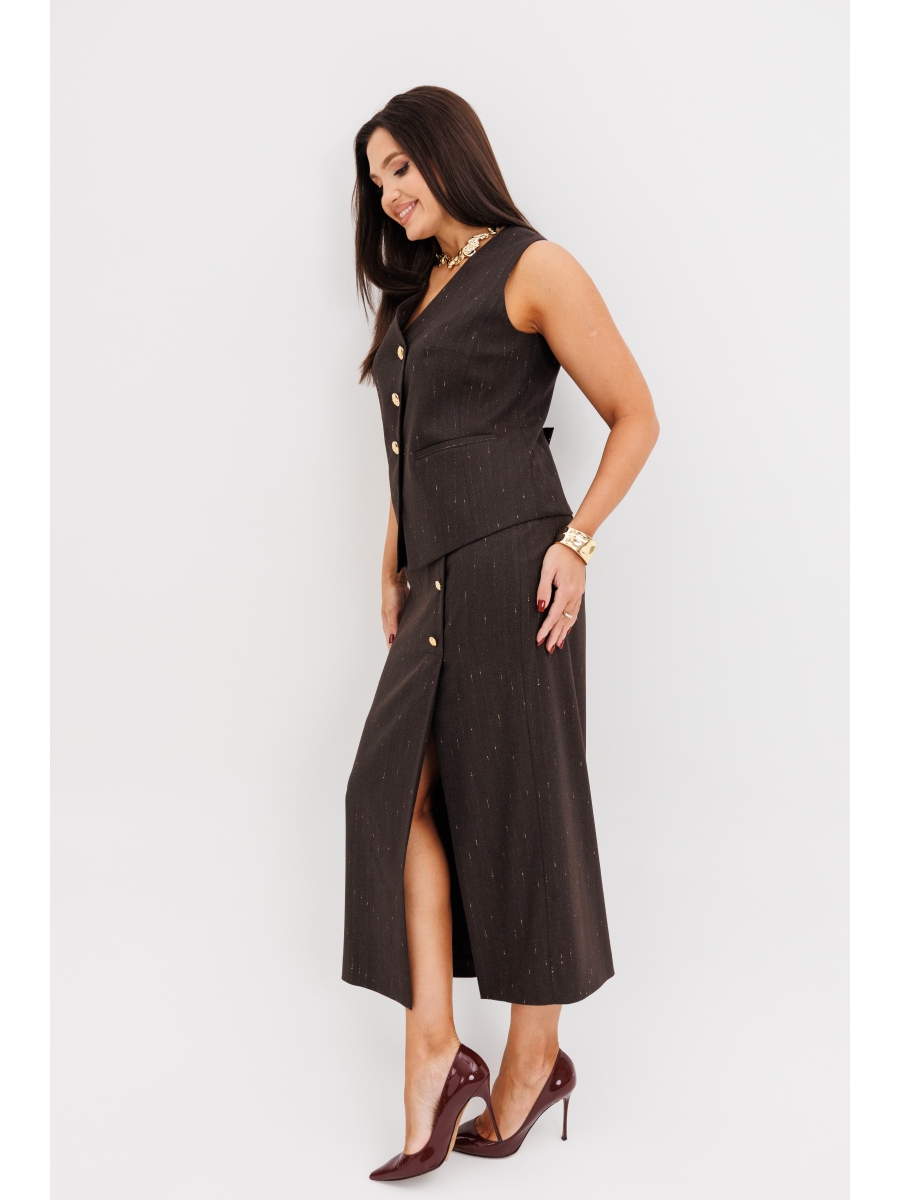 Элегантный женский костюм с жилетом и юбкой выполнен из качественной поливискозной ткани с деликатным вкраплением люрексовой нити, что придаёт образу изысканное сияние и благородство.