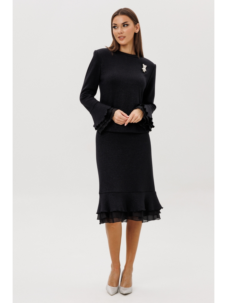 Изящный юбочный комплект из мягкого вискозного трикотажа с деликатным вкраплением люрекса — воплощение утончённости и женственности.