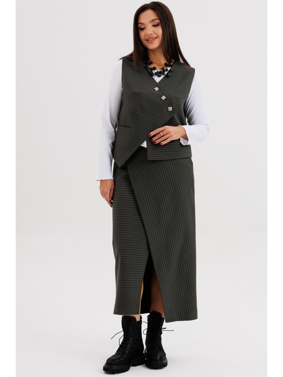 Жилет без рукавов застёгивается на декоративные пуговицы, создавая выразительный акцент в образе. Юбка миди с запахом добавляет женственности и комфорта при движении.