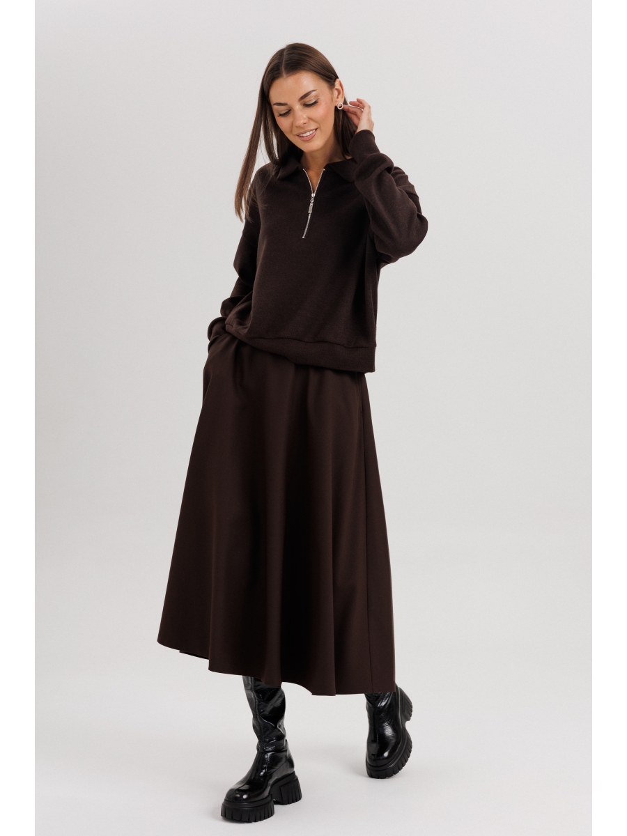 Джемпер из трикотажа. Это одна из базовых вещей осенне-зимнего сезона. Он тёплый, удобный и невероятно комфортный. К тому же, настолько универсален, что его можно стилизовать абсолютно разными способами. Свободный покрой с заниженной линией плеча, рукав рубашечного покроя на отрезной манжете, воротник классический, по центру полочки частичная застёжка-молния. По низу джемпера - отрезной пояс.