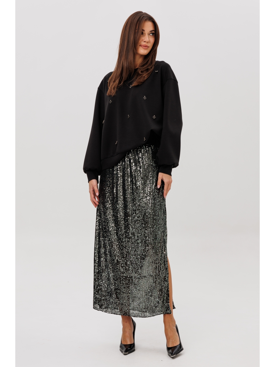 Юбка выполнена из трендового полотна в пайетку. Юбка прямая, длинная на эластичном поясе и подкладке.