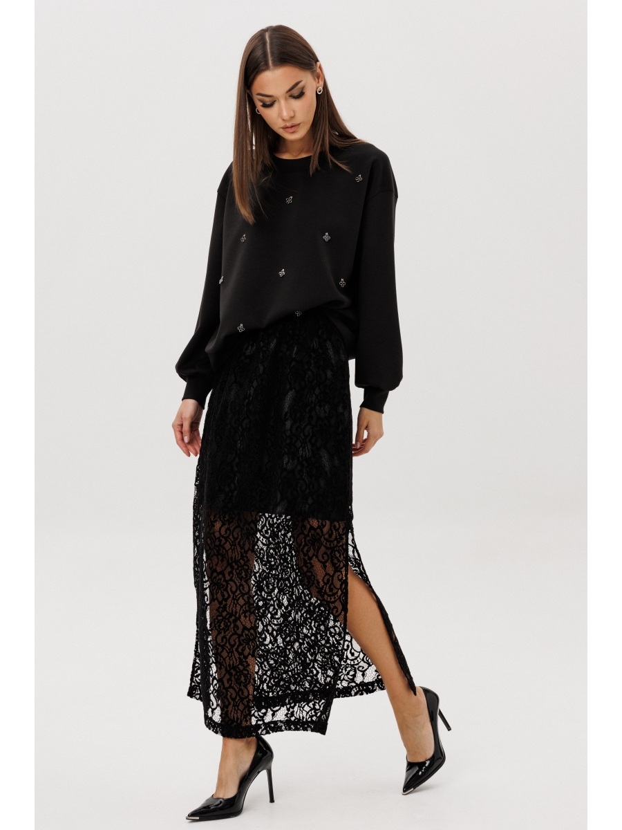 Юбка выполнена из трендового шенилового гипюра с укороченной подкладкой, что придаёт образу лёгкость и современную многослойность.