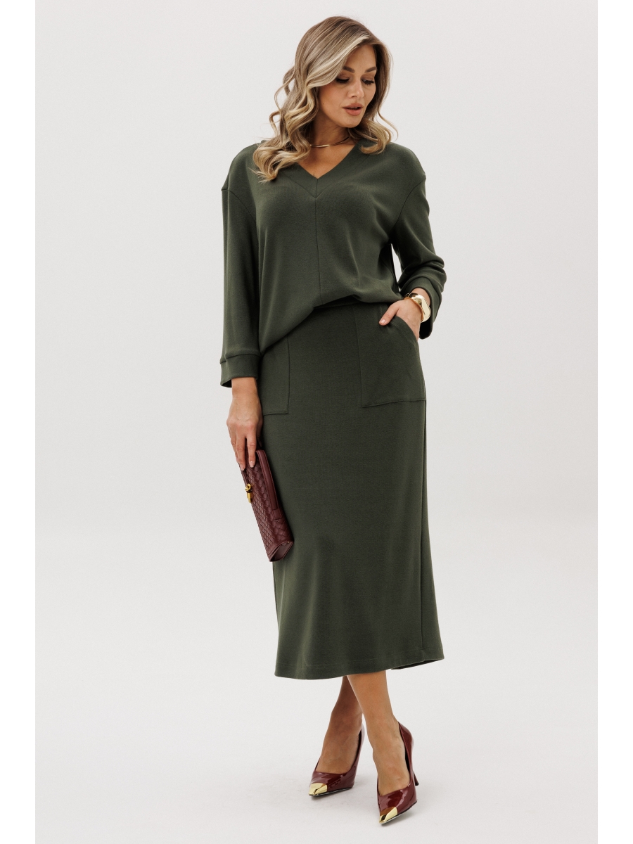 Юбка макси, на притачном эластичном поясе с большими накладными карманами на переднем полотнище. Заднее полотнище с центральным швом, шлицей, талиевыми вытачками и застёжкой.